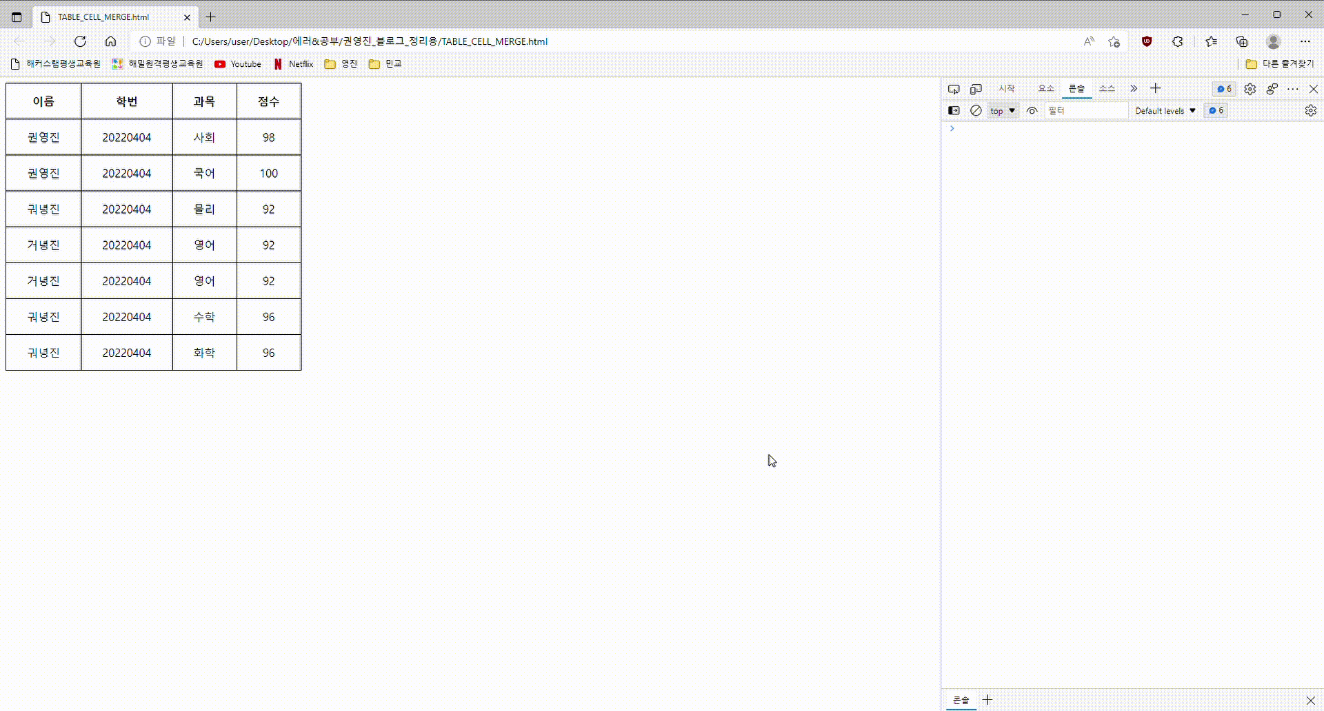 <!doctype html> <html> <head> <script src="https://code.jquery.com/jquery-latest.min.js"></script> <style> table{ border-collapse: collapse; border: 1px solid black; } table th, table td{ border: 1px solid black; text-align: center; padding: 15px 30px; } </style> </head> <div> <table> <thead> <tr> <th>이름</th> <th>학번</th> <th>과목</th> <th>점수</th> </tr> </thead> <tbody> <tr> <td>권영진</td> <td>20220404</td> <td>사회</td> <td>98</td> </tr> <tr> <td>권영진</td> <td>20220404</td> <td>국어</td> <td>100</td> </tr> <tr> <td>궈녕진</td> <td>20220404</td> <td>물리</td> <td>92</td> </tr> <tr> <td>거녕진</td> <td>20220404</td> <td>영어</td> <td>92</td> </tr> <tr> <td>거녕진</td> <td>20220404</td> <td>영어</td> <td>92</td> </tr> <tr> <td>궈녕진</td> <td>20220404</td> <td>수학</td> <td>96</td> </tr> <tr> <td>궈녕진</td> <td>20220404</td> <td>화학</td> <td>96</td> </tr> </tbody> </table> </div> <script> // 테이블을 병합하는 FUNCTION function mergeCell(idx){ let tr_all = document.querySelectorAll('tbody > tr'); let compare_text = null, select_text = null; let all_tr_list = [], current_tr_list = []; tr_all.forEach((tr)=>{ let tr_idx = tr.rowIndex; if(compare_text == null){ current_tr_list.push(tr); compare_text = $(tr).find('td').eq(idx).text(); }else{ select_text = $(tr).find('td').eq(idx).text(); if(select_text == compare_text){ current_tr_list.push(tr); }else{ all_tr_list.push(current_tr_list); current_tr_list = [tr]; compare_text = select_text; } } // 전체 tr의 길이와 선택된 tr의 index가 일치할 경우 (끝) if(tr_idx === tr_all.length){ all_tr_list.push(current_tr_list); all_tr_list.forEach((current_tr_list)=>{ if(current_tr_list.length > 1){ current_tr_list.forEach((current_tr,current_tr_idx)=>{ if(current_tr_idx == 0) $(current_tr).find('td').eq(idx).prop('rowSpan', current_tr_list.length); else $(current_tr).find('td').eq(idx).hide(); }) } }) } }) } </script> </html>