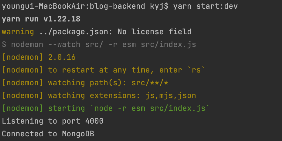 Connected to MongoDB 위 이미지와 같이 연결이 잘 되는 것을 확인 할 수 있었다.